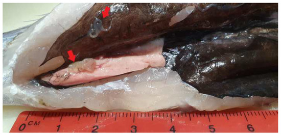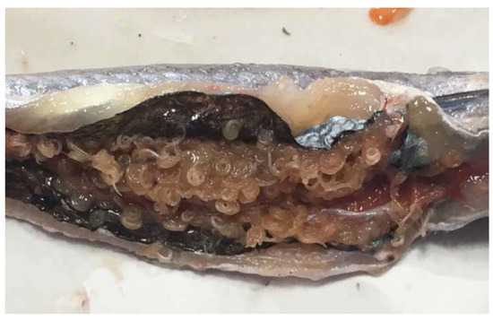 Our findings suggested that gutting procedures were generally carried out correctly at the supermarket, since a low number of fish presented remaining viscera. However, it is important to highlight the risk of anisakidosis and potential damage to consumer confidence that these specimens present, since all of theme possessed macroscopically visible mobile nematodes and coiled and encapsulated larvae in the peritoneum and the remains after evisceration, and even massive infection (more than 30 larvae) in some specimens, as previous studies have found [45,54]. Llanera-Reino et al. found larvae in the liver and gonads from gutted European hake, even after washing with tap water [52].