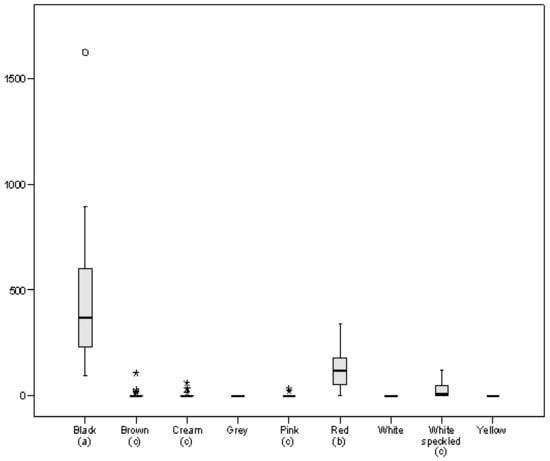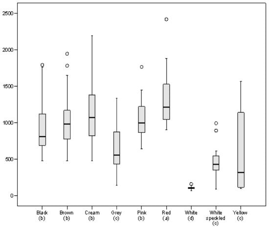 Boxplot representing total phenolic content (TPC), expressed as µg gallic acid equivalent (GAE)/g, in the bean panel grouped by seed coat colour. Different letters in parentheses indicate significant differences at p < 0.05.
