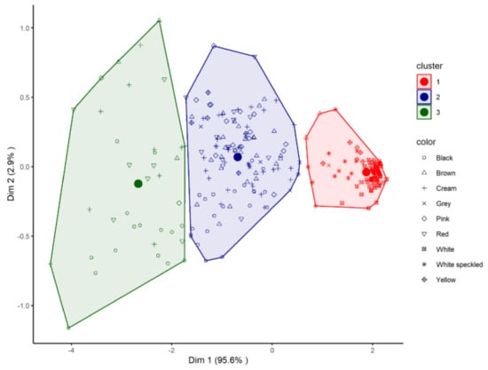 -Cluster 1, consisting of 97 samples, mostly white or white speckled (n = 86) and some samples of different colours (7 yellow, 2 grey and 2 brown). According to Duncan’s test, this group showed the lowest average values in TPC (713 µg GAE/g), FRAP (7.2 µmol Fe (II)/g) and DPPH (1.9 µmol TE/g).