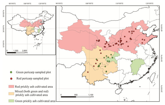 Prickly ash samples were collected from 72 plantations across 12 provinces (Shandong, Hebei, Shanxi, Shaanxi, Henan, Gansu, Qinghai, Sichuan, Chongqing, Guizhou, Jiangxi, and Yunnan). The red pericarp samples (Z1–Z55) were from 55 plantations, and the green pericarp samples (Z56–Z72) were from 17 plantations (Figure 1). About 0.5 kg of mixed topsoil samples (0–5 cm) were collected from five sites on each plantation, and 5 kg of mixed fruit samples were collected randomly from five trees on each plantation. A minimum of three biological repetitions were created for each plantation for testing the fruit and topsoil samples. Information on the samples was recorded (Table S1), and collected samples in valve bags from each plantation were transported to the laboratory. The pericarps were separated from dried fruit, and then dried soil and pericarp samples were ground to a homogenized powder.