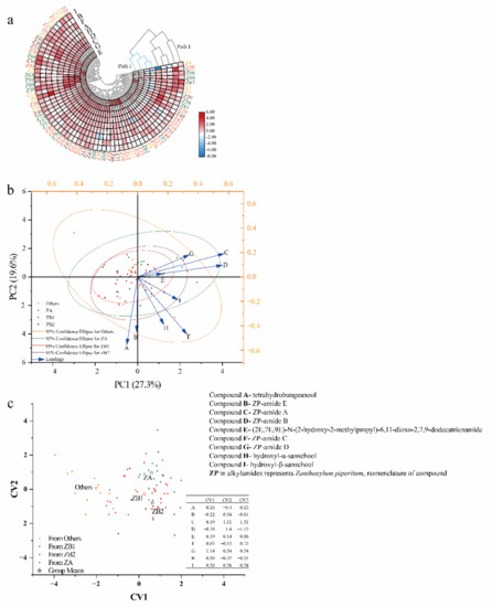 Geographical differentiation of prickly ash pericarps from 72 plantations based on alkylamide profiling of pericarps: (a) cluster heat map, (b) loading plot and score for the first two principal components, and (c) discriminant analysis. PC indicates principal component; CV stands for canonical variable; ZA (n = 18) represents green pericarps derived from the species of Zanthoxylum armatum; ZB1 (n = 28) represents red pericarps derived from the species of Z. bungeanum from Hancheng; ZB2 (n = 13) represents red pericarps from Fengxian; and Others (n = 13) represents the rest of the samples that have red pericarps, and is a mixture of species excluding Z. bungeanum.