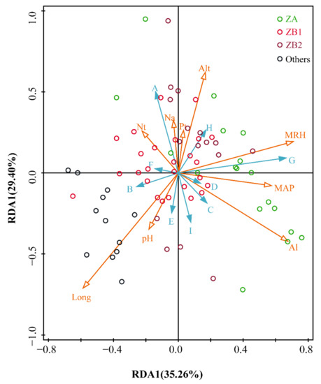 RDA represents redundancy analysis; ZP in alkylamides represents Zanthoxylum piperitum; ZA (n = 18) represents green pericarps derived from Zanthoxylum armatum; ZB1 (n = 28) represents red pericarps derived from Z. bungeanum from Hancheng; ZB2 (n = 13) represents red pericarps from Fengxian; Others (n = 13) represents the rest of the samples that have red pericarps, excluding Z. bungeanum; A represents tetrahydrobungeanool; B represents ZP-amide E; C represents ZP-amide A; D represents ZP-amide B; E represents (2E,7E,9E)-N-(2-hydroxy-2-methylpropyl)-6,11-dioxo-2,7,9-dodecatrienamide; F represents ZP-amide C; G represents ZP-amide D; H represents hydroxyl-α-sanschool; I represents hydroxyl-β-sanschool; Long represents longitude; Al represents aluminum content in the soil; Nt represents total nitrogen content in the soil; MRH represents mean relative humidity; Na represents available nitrogen content in the soil; As represents arsenic content in the soil; pH represents power of hydrogen; MAP represents mean annual precipitation; and Pb represents lead content in the soil.
