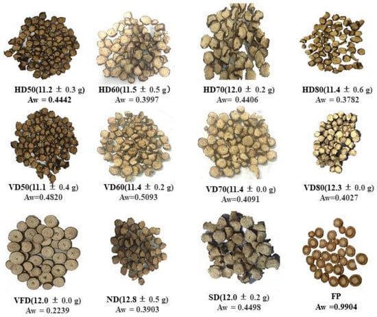 Appearance and dry weight of dried burdock root treated by different drying methods. (n = 3; the fresh weight for burdock is 60 g, and the dry weight are expressed as Mean ± SD; HD50–80 means hot air drying at 50–80 °C, VD50–80 means vacuum drying at 50–80 °C, VFD means vacuum freeze drying, ND means natural drying, SD means sun light drying, FP means fresh pieces and Aw means activity water).