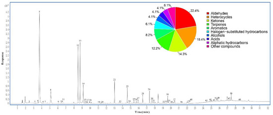 In the study, a total of 49 volatile compounds were identified from BR (Table 2). These compounds mainly comprised of 11 aldehydes, 7 ketones, 9 heterocycles, 6 terpenes, 4 aromatics, 3 halogen-substituted hydrocarbons, 2 alcohols, 2 acids, 2 aliphatic hydrocarbons, and 3 other compounds.