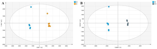 The OPLS−DA scores plot: (A) comparison between natural drying (ND) and sunlight drying (SD), (B) comparison between ND and vacuum freeze drying (VFD); (n = 6).