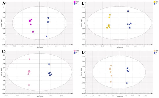 The OPLS−-DA scores plot for comparisons between the different temperatures of hot air drying (HD) and natural drying (ND) (n = 6): (A) for HD50 and ND, (B) for HD60 and ND, (C) for HD70 and ND, (D) for HD80 and ND.
