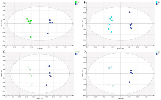The OPLS−DA scores plot for comparisons between the different temperatures of vacuum drying (VD) and natural drying (ND) (n = 6): (A) for VD50 and ND, (B) for VD60 and ND, (C) for VD70 and ND, and (D) for VD80 and ND.