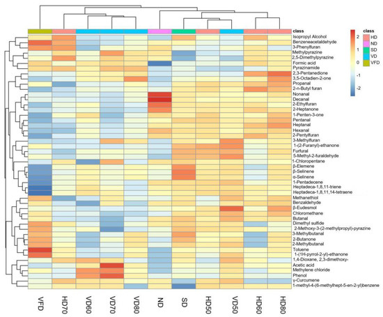 Heatmap of the volatile profiles of burdock root (BR). The legend on the left and bottom indicates the grouping of volatiles and sample groups, respectively (HD: hot air drying, ND: natural drying, SD: sunlight drying, VD: vacuum drying, VFD: vacuum freeze drying) (n = 6).