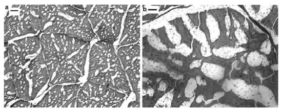 Micrographs representation of crab tissue frozen at different rates and local characteristic freezing times (tc); (a) tc = 11 min; bar represents 100 µm; (b) tc = 29 min; bar represents 50 µm. Reproduced from Dima et al. [83], with permission from Elsevier, 2014.