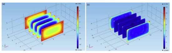Uyar et al. [118] developed a validated FEM for an RF system to obtain the electrical field distribution inside a RF system and temperature distribution in a frozen product (lean beef meat) while thawing. To determine these distributions, a Fourier heat transfer equation with a generation term coupled with the quasi-static electro-magnetic field equations, in addition to handling the phase change, was solved as shown in Equations (6) and (7). Additionally, the model solved coupled heat conduction and the electric field in a 3D domain with the dependency of thermophysical and dielectric properties on temperature.