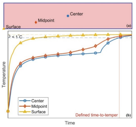 Recently, the study by Shan and Heldman [136] focused on evaluating the effects of ambient temperature (Ta), convective heat transfer (h), product dimension and product composition on the tempering time of frozen meat (pork). The study used a FEM to simulate the temperature distribution within the frozen product during the tempering process. In the simulation, the product was considered as a homogenous mixture of all components with no drip loss occurring during tempering. From the results, h from 200 W m−2 K−1 and above does not significantly reduce the tempering time while more variations were observed on the effect of h on tempering time when h was between 0 and 200 W m−2 K−1. In the study, three positions (Figure 3a) were of interest and an illustration of the temperature profile, including the defined time to temper, is shown in Figure 3b.