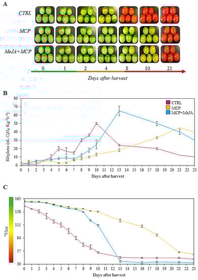 Characterization of tomato (Solanum lycopersicum L. cv. Grape) fruits treated with 1-methylcyclopropene (MCP) and both hormones, namely 1-methylcyclopropene and methyl jasmonate (MCP+MeJA), during ripening. (A) Representative images of tomatoes. Effects of MCP and MCP + MeJA on ethylene emission (B) and fruit color (C) compared to the control group (CTRL). Values are means ± standard error of four biological replicates of at least 10 fruits each.