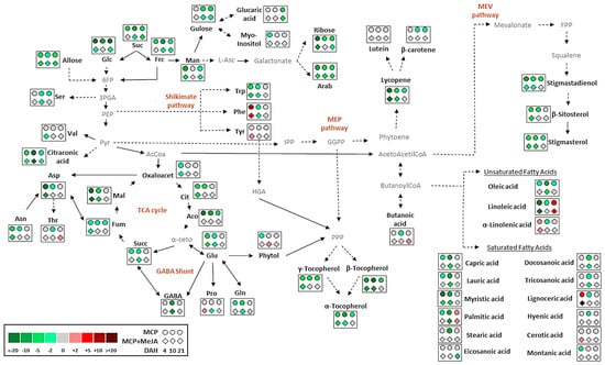 Primary metabolism is essential for fruit quality. Sugars, organic acids, and amino acids are responsible for the taste of tomato fruits, facilitating sensory perception. Amino acids and fatty acids play important roles as precursors of aroma compounds []. Treatment with 1-methylcyclopropene impacted sugar and organic acids, inhibiting their production during ripening. Fruits treated only with 1-methylcyclopropene were most affected, showing a greater delay in accumulating sugars and organic acids than fruits treated with both 1-methylcyclopropene and methyl jasmonate (Figure 3). For instance, glucose showed a 22-, 13-, and 23-fold reduction at 4-, 10-, and 21 DAH, respectively, in MCP, as compared to the CTRL. Mannose, ribose, and malic and aconitic acids exhibited a 14-, 30-, 21-, and 20-fold decrease in levels at 4 DAH, respectively. Conversely, fructose, sucrose, and citraconic acid showed a 12-, 15-, and 27-fold decrease in levels at 10 DAH when MCP was compared with the CTRL (Table 1). Reductions in the levels of these metabolites in fruits treated with 1-methylcyclopropene are shown in (Figure 2), based on the fold-change analysis of the treated fruits and control group.
