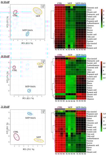 A PCA was performed on primary metabolites at the 4th, 10th, and 21st ripening stages, confirming the high reproducibility among the four biological replicates and groups analyzed. Moreover, clear separation of the CTRL group and both treated groups was evidenced for the primary metabolites in the PCA score. Heatmap analysis was used to analyze the differences between treated and untreated groups regarding the metabolite changes on each day after harvest (Figure 3, Figure 4 and Figure 5).