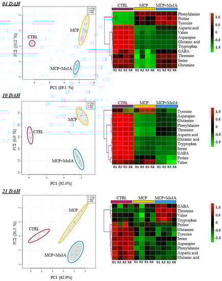 Relative contents of amino acids in tomato pericarp (Solanum lycopersicum L. cv. Grape) exposed to 1-methylcyclopropene (MCP) and both hormones, 1-methylcyclopropene and methyl jasmonate (MCP+MeJA), as compared to the control group (CTRL). Unsupervised principal component analysis (PCA-score) and heatmap analysis represent the major sources of variability. Color scale represents the variation in the relative concentration of compounds, from low (green) to high (red) contents at 4, 10, and 21 days after harvest (DAH).