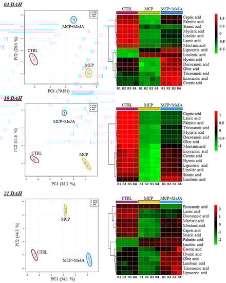 Relative contents of fatty acids in tomato pericarp (Solanum lycopersicum L. cv. Grape) exposed to 1-methylcyclopropene (MCP) and both hormones, 1-methylcyclopropene and methyl jasmonate (MCP+MeJA), as compared to the control group (CTRL). Unsupervised principal component analysis (PCA-score) and heatmap analysis represent the major sources of variability. Color scale represents the variation in the relative concentration of compounds, from low (green) to high (red) contents at 4, 10, and 21 days after harvest (DAH).