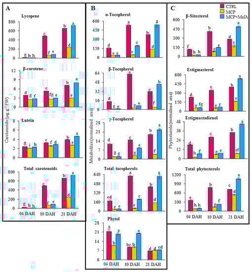 Secondary metabolites in tomato pericarp (Solanum lycopersicum L. cv. Grape) exposed to 1-methylcyclopropene (MCP) and both hormones, 1-methylcyclopropene and methyl jasmonate (MCP+MeJA), compared to the control group (CTRL) at 4, 10, and 21 days after harvest (DAH). Contents of carotenoids (A), normalized area of tocopherols and phytol (B), and phytosterols (C). Values are means ± SE of four biological replicates of 10 fruits each. Different letters indicate statistically significant differences (p < 0.05).