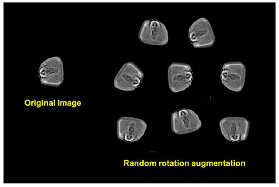 The images were rotated clockwise or counterclockwise, with angles randomly defined (Figure 1). This method uses bilinear interpolation that preserves straight-line features through the image, producing a smoother interpolation than does the nearest neighbor approach. The flip transformation combines image rotation by multiple angles of 90° with the calculation of the transposed matrix of the original image pixel, reversing the pixels horizontally or vertically. A horizontal flip rotates the image 90° clockwise or 270° counterclockwise under transposition of the original image, while a vertical flip rotates the image 90° counterclockwise or 270° clockwise under the transposed matrix.