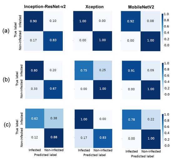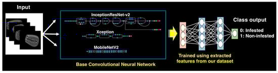 We compared the performance of three different architectures, (i) Inception-ResNet-v2 [], (ii) Xception [] and (iii) MobileNetV2 [] (Figure 2), and the weights of the convolutional layers were trained on the ImageNet dataset []. We used models with pre-trained weights of the convolutional layers, and the last fully connected layer was replaced with a single neuron in the output layer with loss function binary cross-entropy. The output neuron contains probabilities (0 ≤ p ≤ 1) that the input image belongs to class 0 (infested) or 1 (non-infested).