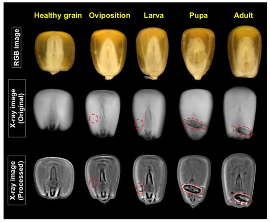 RGB images of non-infested maize grains (healthy grain) and grains infested with Sitophilus zeamais during oviposition, larva, pupa and adult stages and corresponding traditional X-ray images and after processing using peripheral equalization and calcification emphasis algorithms. Red circles/ellipses indicate infested regions inside the grain.
