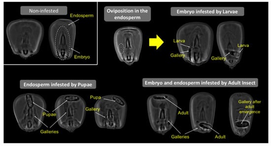 X-ray imaging is a non-destructive technique to efficiently overcome such challenges, with rapid and reliable detection of weevils on the inner parts of a grain [,]. Maize grains infested by Sitophilus zeamais exhibited internal damages characterized by the absence of tissues that are referred to as “galleries”, and these regions appear darker on the radiographic images. This occurs due to the lower density of grain tissues [] as a result of mass loss by insect feeding, while the electromagnetic radiation of X-rays is relatively short (high frequency), with wavelengths ranging from 0.01 to 10 nm []. The onset of insect attack occurs when the female, after mating, inserts the eggs in the grain, and then the eggs hatch into larvae, building galleries into the embryo or in the endosperm. Larvae, pupae and adults cause considerable damages by consuming the internal structures of the endosperm grain that do not exhibit any external symptoms (Figure 3).