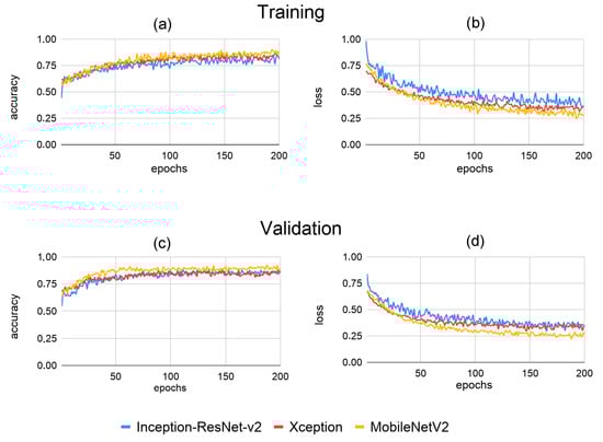 Performances on training (a,b) and validation (c,d) datasets during the learning process of Inception-ResNet-v2, Xception and MobileNetV2 architectures for classification of X-ray images from non-infested maize grains and grains infested with Sitophilus zeamais.