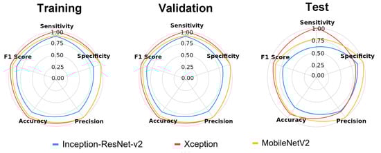 Classification performance in terms of precision, accuracy, sensitivity, specificity and F1 Score was also measured (Figure 7). The precision measures the number of X-ray images that were correctly classified as infested class (positive predictive value), with greater values shown for MobileNetV2 and Xception models on training and validation sets (1.00). In the test set, the precision of the Xception model was reduced to 0.85, while MobileNetV2 remained equal to 1.00. Again, both models achieved the best accuracies for training, validation and test sets (0.88–1.00).