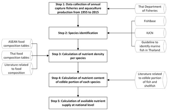 To estimate the edible raw portions of fish and shellfish species, we used data from multiple sources, because the food composition database in Thailand was not able to provide an edible portion of fishery products. We converted the total yield of fishery products to edible weights, as nutrient availability from fishery products is often listed as nutrient content per hundred grams (i.e., density) of edible portion. For species where the data on nutrient content of fish and shellfish at the species level were not available, we used the data of other species belonging to the same genus and/or family following the guidelines of FAO (2016) [35]. In cases where data of the family were also absent, we used the average of the general group that the species belonged to, e.g., shrimp, fish, or crab (Figure 1). All data (i.e., landings, edible portions, and nutrition profiles) were entered into an Excel spreadsheet to assess the national nutrient availability. The descriptive results were presented as mean ± standard deviation (SD).