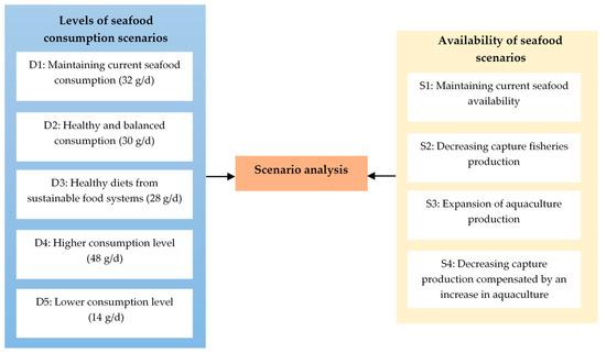 Schematic diagram of the scenario analysis considering different scenarios of Thai seafood availability and consumption.