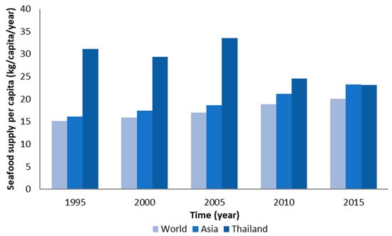 Global seafood supply has continuously increased from an average of 15 kg/y in 1995 to 20 kg/y in 2015. Similarly, the average supply of seafood products in Asia has increased from 16 kg/y to 23 kg/y. Although the average seafood supply per capita in Thailand was found to be greater than the average in other Asian countries and globally, there was a decrease from 31 kg/y to 23 kg/y over the same period (Figure 3) [48].