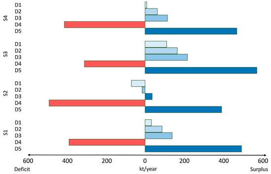 Difference (kt/year) between the levels of Thai seafood availability and consumption scenarios in 2030. D1: Maintaining current seafood consumption (32 g/day), D2: Healthy and balanced seafood consumption (30 g/day), D3: Healthy diets from sustainable food systems (28 g/day), D4: Higher consumption (48 g/day), and D5: Lower consumption (14 g/day). S1: Maintaining current seafood availability, S2: Decreasing capture fisheries (13% of reduction of yield of capture production in 2015), S3: Expansion of aquaculture production (1% of increase of yield of aquaculture), and S4: Combination of S2 and S3. Blue bars represent the surplus of Thai seafood availability and consumption in 2030 while red bars represent the deficit of Thai seafood availability and consumption in 2030.