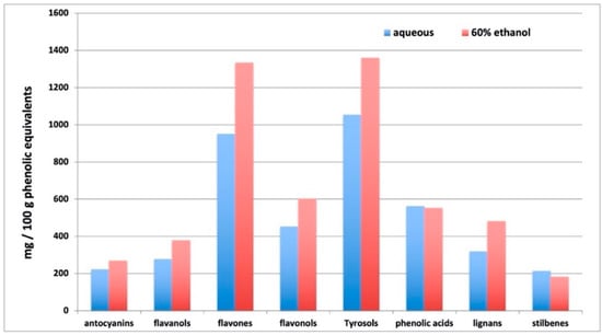 As expected, the ethanolic solution was generally more effective in extracting phenolics, even though phenolic acids did not change (fold-change 0.98) and stilbenes decreased in ethanolic solution (fold-change = 0.85). In more detail, flavones were the most represented, ranging from 950 to 1334 mg/100 g in aqueous and ethanolic extract, respectively, together with tyrosol equivalents (alkylphenols, tyrosols, phenolic terpenes, and other low molecular weight phenolics—1053 to 1360 mg/100 g in aqueous and ethanolic extract, respectively). Among flavone equivalents, flavanones (naringenin and naringin derivatives), apigenin and luteolin conjugates, and isoflavonoids (daidzein and genistein derivatives, among others) were the most represented. Notwithstanding, the extracts were rich in anthocyanins such as cyanidin, malvidin and petunidin glycosides, flavanols, proanthocyanidins dimers and trimers, lignans and stilbenes were present in appreciable amounts. The whole phenolic profile is summarized in Figure 1, where cumulate abundances per each phenolic sub class are provided as a function of the extraction solvent.