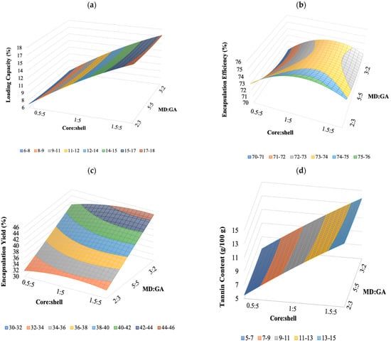 To visualize the relationship between the response and experimental levels of the independent variables, 3D surface response plots were constructed according to the quadratic polynomial model Equations (9)–(12) (Figure 2a–d). The surface plots are a very useful tool in examining the main effect and interaction effects of two or more factors. The plots were created by plotting the response against two independent variables using the z-axis. The 3D plot of the response surface of regression Equation (9) showed the effects of the core:shell and MD:GA ratio and their interaction on the LC (Figure 2a). Accordingly, the LC increased with the increase of core:shell ratio at any given MD:GA ratio similarly to TC as shown by the plot of the regression Equation (10) in Figure 2b. Instead, the response plot in Figure 2b,c, related to the Equations (11) and (12), respectively showed that was improved with an increasing amount of MD:GA and a core:shell ratio close to 1:5 EE instead the EY was higher with a core:shell ratio of 1.5:5 and MD:GA of 3:2.