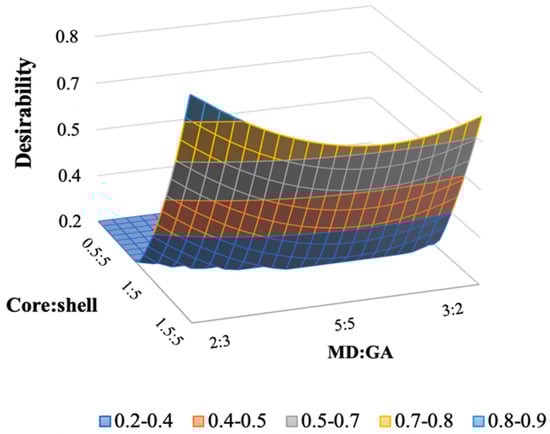 Response surfaces plot of desirability for the studied core:shell and MD:GA ratio.