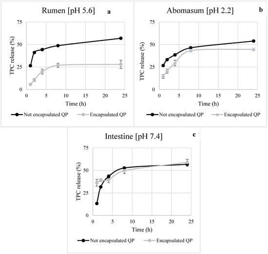 Controlled release of bioactive compounds at the right place and time is one of the more interesting functionalities that can be provided by microencapsulation. Timely and targeted release improves the efficacy of a bioactive compound and often its bioavailability [38]. The release profile of TPC from the not encapsulated QP and the encapsulated under optimal core:shell and MG:GA ratio in acetate, phosphate, and HCl buffer elution media was reported in Figure 5a–c. At pH 5.6 and 2.2, which simulated rumen and abomasum conditions, respectively, a strong reduction in TPC release from microencapsulated QP compared to the not encapsulated QP was observed. A different trend was recorded in the intestinal environment at pH 7.4, where a burst release pattern of TPC similar to not encapsulated extract was obtained. This result might be due to GA properties. In detail, it has been reported that GA tends to swell and disrupt the structure of GA microparticles in elution media with pH values higher than 6.5, resulting in more porous microparticles [39]. The intrinsic properties of the shell materials, the chemical interactions between the shell materials and the encapsulated compound, and the environment affect the release behavior. Since the modulation of the biohydrogenation by the condensed tannins contained in QP occurs in rumen, the microencapsulated form could allow a slow release and increase the bioavailability of compounds [6,7].