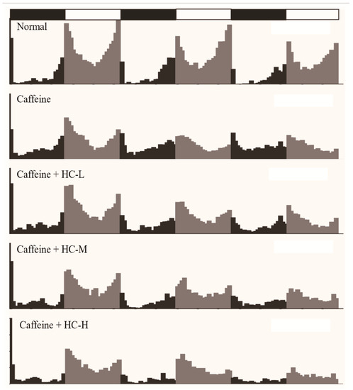 The effect of HC on the overview of locomotor activities in D. melanogaster during the 3-day intervention period. Black represents night activity, and gray represents daytime activity. Normal: agar-sucrose food; Caffeine: agar-sucrose food containing 0.1% caffeine; Caffeine + HC-L: agar-sucrose food containing 0.1% caffeine + 0.625% HC extract; Caffeine + HC-M: agar-sucrose food containing 0.1% caffeine + 1.250% HC extract; Caffeine + HC-H: agar-sucrose food containing 0.1% caffeine + 2.500% HC extract.