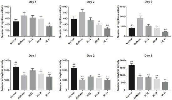 The number of sleep bouts and sleep duration of D. melanogaster during the night can provide some indication of sleep quality [13]. Compared with the caffeine group, all HC groups reduced the number of sleep bouts, while only that of the HC-M group was obviously decreased on day 1 (Figure 3). Meanwhile, we found that all HC groups elevated the sleep duration more than that of the caffeine group (Figure 3). Of them, there was a statistical difference between the HC-M group and the caffeine group (p < 0.05). On day 2, caffeine elevated the sleep bouts of D. melanogaster (p < 0.05), while HC reduced the number of sleep bouts in a dose-dependent manner. Among them, the HC-M and HC-H groups significantly reducing the number of sleep bouts compared with the caffeine group (p < 0.05). The results of sleep duration provided further evidence that HC improved the sleep duration in a dose-dependent manner (Figure 3). Interestingly, there were no significant changes in the number of sleep bouts among the caffeine group and the HC groups on day 3. In addition, consistent results of sleep duration were found among the caffeine group and the HC groups on day 3. Although there was no significant difference in sleep duration found between the HC-H group and the caffeine group, the average sleep duration of the HC-H group showed an increased tendency. These results indicate that HC could effectively improve total sleep time in a dose-dependent manner and regulate the sleep bouts and sleep duration in caffeine-induced insomnia in D. melanogaster.