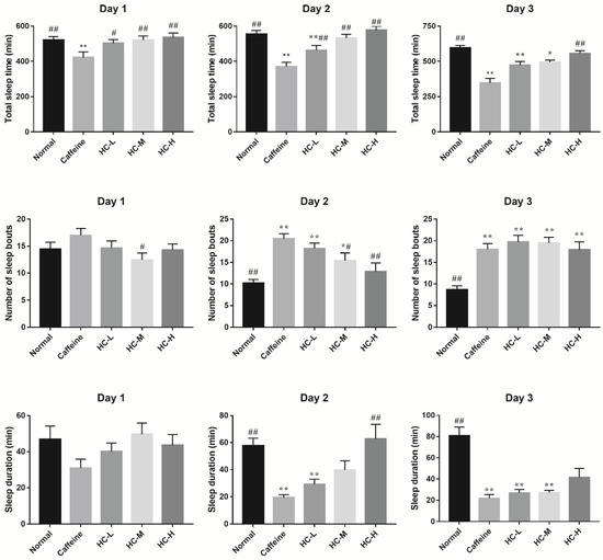 For the total sleep time, compared with the normal group, caffeine effectively reduced the total sleep time of D. melanogaster, indicating the insomnia model was successfully built (Figure 3). In addition, we found that HC elevated the total sleep time of D. melanogaster in a dose-dependent manner over a 3-day period. In particular, all HC groups significantly improve the total sleep time of D. melanogaster in comparison with the caffeine group (day 1–day 3, p < 0.05), indicating that HC could prolong the sleep time of D. melanogaster induced by caffeine.