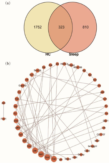 (a) The intersection targets of HC and sleep; (b) the protein-protein interaction (PPI) network of D. melanogaster constructed by intersection targets. The size of nodes represents the value of degree.