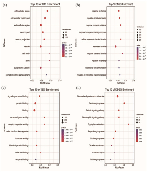 To gain further insight into the relationship between sleep and HC, KEGG pathway enrichment analysis was carried out. As a result, 10 remarkable pathways related to sleep were selected, which mainly involved the neuroactive ligand-receptor interaction, serotonergic synapse, relaxin signaling pathway, neurotrophin signaling pathway, tryptophan metabolism, dopaminergic synapse, cholinergic synapse, circadian entrainment, circadian rhythm, and GABAergic synapse (p < 0.05). Among them, neuroactive ligand-receptor interaction was the most important topological pathway, and is closely associated with neurological function [58]. Furthermore, the neurotransmitters for serotonin, GABA, acetylcholine, and dopamine play key functions in regulating sleep and wakefulness [59,60,61]. These results further reveal that the sleep-improvement effects of HC involve multiple targets and multiple pathways.