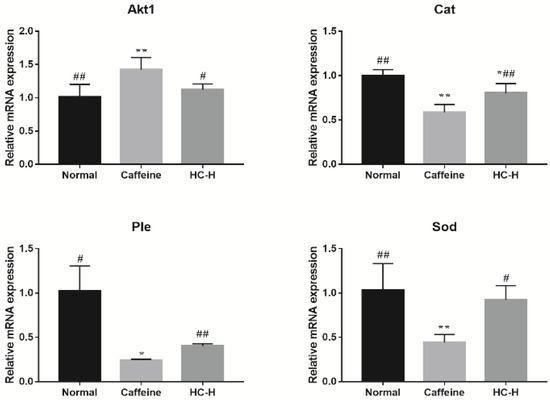 The D. melanogaster were fed with the corresponding diets (normal, caffeine, caffeine + 2.5% HC) in constant darkness for 3 days (n = 50). Total RNA was extracted from the heads of D. melanogaster using Trizol (GBCBIO Technologies, Guangzhou, China), according to the manufacture’s protocol. A reverse transcription reagent kit (TaKaRa, Dalian, China) was then used to obtain cDNA, and the mRNA expression levels were determined by RT-PCR using TB Green Premix Ex TaqII (TaKaRa, Dalian, China). The measured genes included Akt1, Sod, Cat, and Ple, and the Rp49 was used for the endogenous control [55,56]. The primer sequences have been displayed in Table S1. The relative expression levels were calculated by the ΔΔCt method.