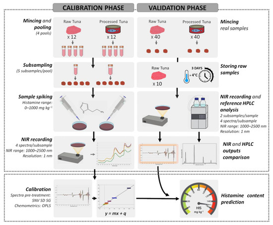 Flowchart summarizing the principal experimental procedure steps for the development of NIR spectroscopy models predicting histamine concentrations in raw and processed tuna samples.