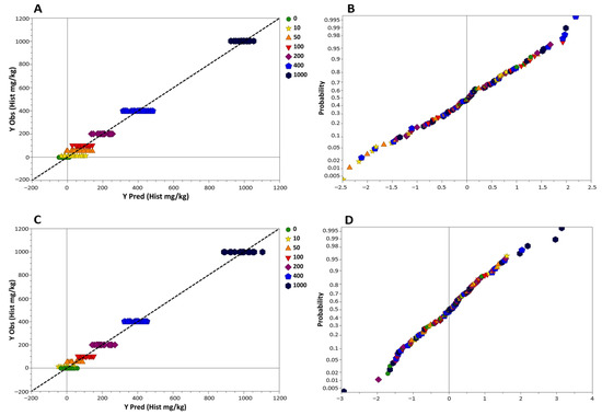 Samples distributing linearly around the regression lines reported in the predicted vs. observed values graph (Figure 2A,C), the r2 values for raw (r2 = 0.987) and processed tuna (r2 = 0.987) regression models, and, finally, the slope values equal to 1 (Table 1), suggest a perfect linearity in the range 0–1000 mg kg−1 and an excellent quantitative prediction [58]. Moreover, the Y-residuals plotted in Figure 2B and Figure 2D were normally distributed, and none of the data point fell outside the three standard deviation boundaries, thus confirming an acceptable data fit.