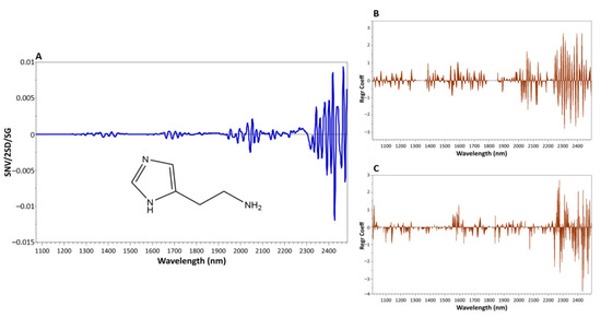 In particular, the highest contribution was exerted by the regression coefficients of the NIR wavelengths beyond the 2200 nm region (Figure 3B,C), which corresponded to the intense absorption bands of histamine in the 2240–2450 nm region (Figure 3A). In this region, the peak around 2475 nm can be directly attributed to symmetric stretching vibrations of the C-N-C bonds typical of nitrogen containing compounds as histamine [70] whose chemical structure is illustrated in Figure 3A. Besides, the peak at 2240 nm has been already related to N-H stretching vibrations of amino acids and recently identified as a characteristic feature of the NIR spectrum of histamine [40]. High regression coefficients were also observed for raw tuna fish-based model in the 2020–2200 nm region, where the peak at 2180 is the consequence of bending vibration of the N–H bond during the second overtone [70]. On the contrary, in the processed tuna fish-based model higher positive and negative regression coefficients appeared around 1280–1400 nm and 1600–1700 nm. Wavelengths falling within these ranges have been assigned to C-H and O-H vibrations typical of fats or aromatic compounds [70], and which could have resulted from the residual packing oils. Absorbances in the region 1666–1562 nm have been attributed to stretching vibrations of C-H, N-H and C≡N bonds [45]. Similarly, other bands around the 1930–2020 nm NIR region of processed tuna (e.g., 1936, 1951, 1979 and 2011) closely characterize fish minor and major compounds, having a link with stretching and combination vibrations of C-H, N-H and C≡C groups and with stretching vibrations of the C=O group [33,42,66].