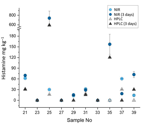 The ability of NIR spectroscopy to predict histamine content regardless of its freshness storage was also demonstrated by storing a total of 10 raw tuna samples at room temperature (20 ± 1 °C) for three days (Figure 4).