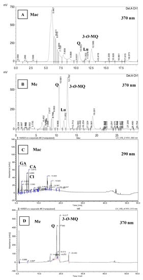 RP-HPLC chromatogram at 370 nm of samples aqueous extract (Mac 10 mg/mL) (A) and ethanolic extract (Me 1 mg/mL) (B). RP-UHPLC chromatogram at 290 nm of aqueous extract (Mac 2 mg/mL) (C) and at 370 nm of ethanolic extract (Me 1 mg/mL) (D). In order of appearance according to the retention times: GA, gallic acid; Cl, chlorogenic acid; CA, caffeic acid; Q, quercetin; Lu, luteolin; 3-O-MQ, 3-O-methylquercetin.