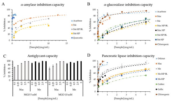 (A,B) Dose-response curves of α-amylase (A) and α-glucosidase (B) inhibition capacities expressed as % inhibition vs. sample concentration (mg/mL). (C) Inhibition capacity (%) of fluorescent AGEs formation with methylglyoxal (MGO) at 5 or 10 mM by different sample concentrations (mg/mL). (D) Dose-response curves of pancreatic lipase inhibition capacity expressed as % inhibition vs. sample concentration (mg/mL). Samples are: marcela aqueous (Mac) and ethanolic (Me) extracts, marcela aqueous HP (Mac HP) and ethanolic HP (Me HP) extracts. Blank of marcela aqueous HP (Mac HP BL) and ethanolic HP (Me HP BL) extracts. Acarbose was used as α-amylase and α-glucosidase inhibitory agent (A,B). Orlistat was used as lipase inhibitory agent (D). Quercetin, caffeic acid, gallic acid and chlorogenic acid were used as standards (A,B,D).