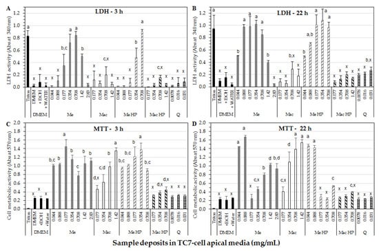 Higher increases in cell metabolic activity was observed (Figure 3D) after 22 h than 3 h of exposure to Me extract at its lowest studied concentrations (0.044–0.088 mg/mL in cell deposit media), but not at higher concentrations (namely 0.177–0.71 mg/mL) probably due to an excessive cell membrane damage as assessed by cellular LDH-leakage (Figure 3B). Figure 3D shows similar viability profiles for Me and Me HP samples after 22 h than 3 h of exposure, suggesting no detrimental effect from HP-process on ethanolic extraction. Higher increase in cell metabolic activity was observed after 22 h than 3 h of incubation with Mac extract in the range 0.354–1.42 mg/mL in apical cell media, due to the longer exposure time without noticeable cell membrane damage. In the case of Mac HP, the longer incubation time (22 h) did not improve the observed cell metabolic activity comparing with DMEM controls, possibly due to low polyphenolic content shown in Table 1.