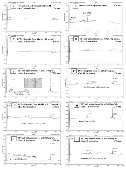 TC7-Cell uptake of marcela aqueous (Mac) and ethanolic (Me) extracts’ compounds after 3 or 22 h of incubation. (A) TC7-cell methanolic extract (Section 2.3.8) for control DMEM. (B) Crude marcela aqueous extract (2 mg/mL) given for comparison. (C–J) TC7-cell methanolic extracts (Section 2.3.8) for Mac 1.42 mg/mL (C), Mac HP 1.42 mg/mL (D), Me 0.177 mg/mL and UV 200–295 nm spectrum for the 5.3 min peak allegedly amino-acids/protein material (E), Me 0.177 mg/mL (F), Me HP 0.177 mg/mL (G), Me 0.354 mg/mL (H), Me 0.088 mg/mL (I,J). Mac and Me concentrations in TC7-Cell apical media, incubation times, and elution wavelength are indicated. Figures can be amplified on the screen.