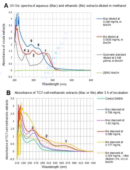 (A) UV-Vis spectra of crude aqueous extract (Mac), crude ethanolic extract (Me) and purified aglycone quercetin from Sigma, diluted in methanol at the indicated concentrations for absorbance measurement. Absorption maxima characteristic of: (1) B-ring absorption (band I) of flavonols (glycosylated Q, 3-O-MQ) and flavones (Lu); (2) hydroxycinnamic acid shoulder, flavanones, all phenolic compounds; (3) shoulder for most flavonols and flavones; (4) A-ring absorption (Band II) of flavonols, flavones; (5) hydroxycinnamic acids; (6) hydroxybenzoic acids and flavanols. (B) UV-Vis spectra of TC7-cell methanolic extracts after 3 h incubation with control DMEM, Mac or Me mixtures deposed at the indicated concentrations in TC7-cell apical media.